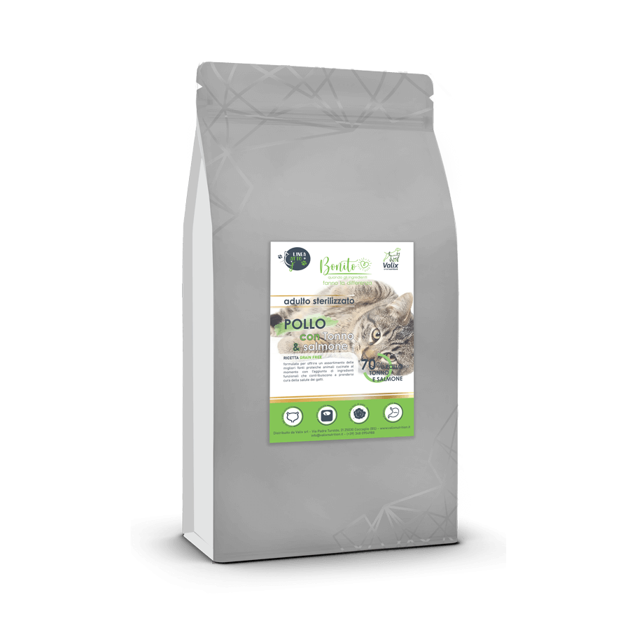 Crocchette ipoallergeniche con il 70% totale di pollo, tonno e salmone.