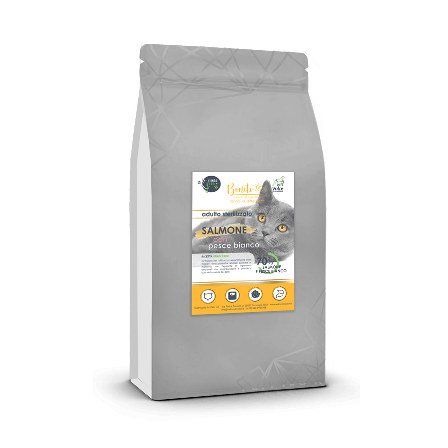 Crocchette ipoallergeniche con il 70% totale di salmone e pesce bianco.